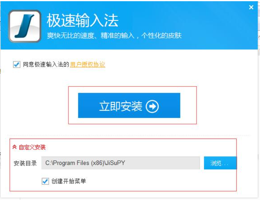 2、進入安裝程序后,點擊同意極速輸入法的用戶授權協議,然后點擊立即安裝。