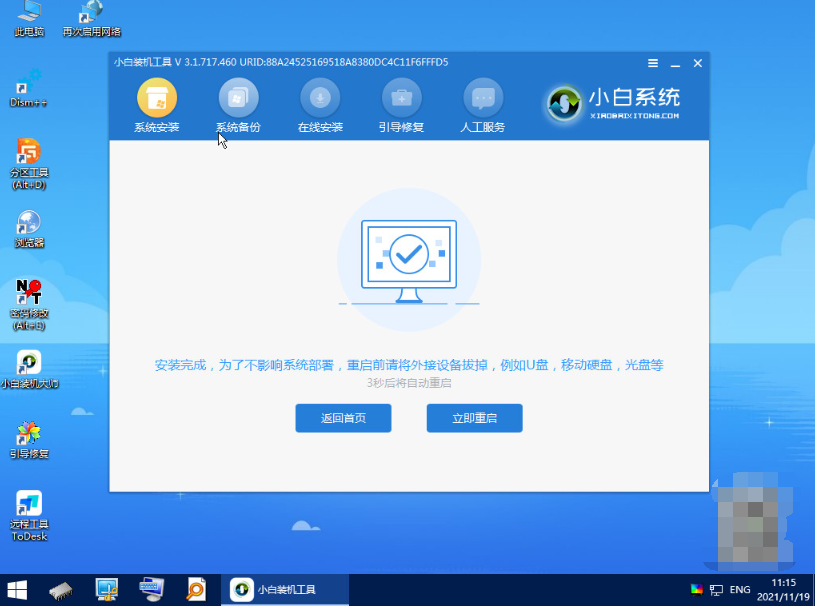 2、當軟件自動下載系統鏡像和部署環境完成后,自動重啟電腦。