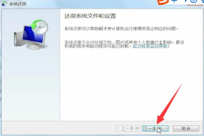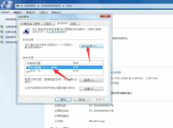 4、彈出系統屬性窗口,點擊系統盤,選擇系統還原,點擊下一步,再次點擊下一步。