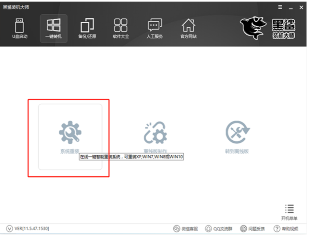 1、首先下載并運行黑鯊一鍵重裝系統軟件,點擊“系統重裝”。