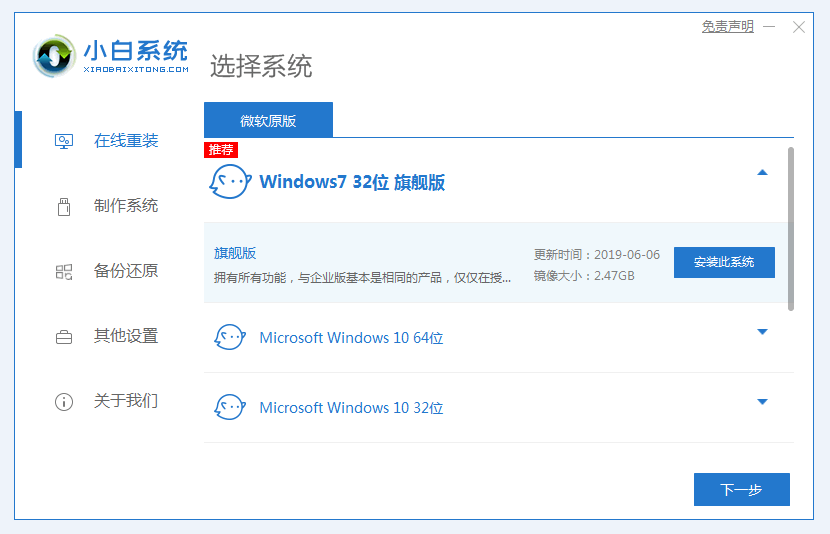 1、在官網上下載小白一鍵重裝系統軟件,選擇win7系統,點擊安裝此系統,下一步。