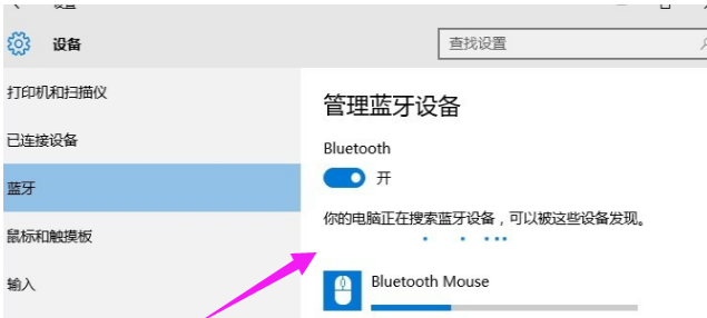 4、這時Win10系統將開始自動搜索周圍打開的可見藍牙設備,這時把藍牙鼠標的右鍵左鍵中鍵(就是滾輪)同時按下5s以上(藍牙鼠標確保已經開啟電源);