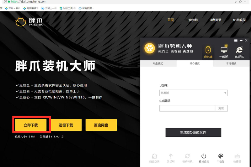 1.打開瀏覽器,搜索胖爪裝機大師官網,進入官網點擊左側"立即下載",將其安裝華碩電腦上。