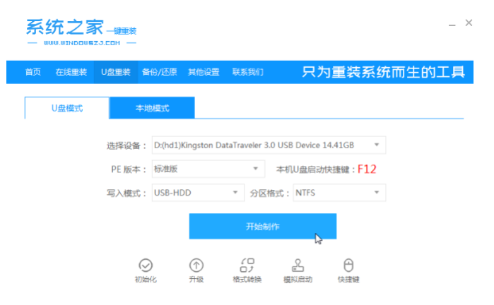 1、下載安裝系統之家一鍵重裝系統工具并打開,選擇u盤模式開始制作。