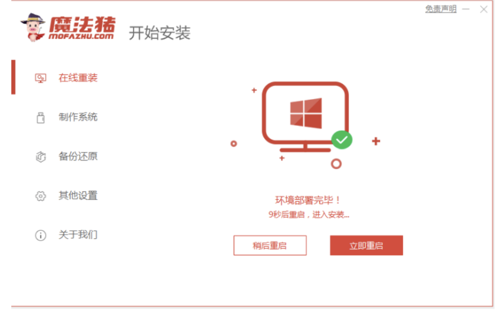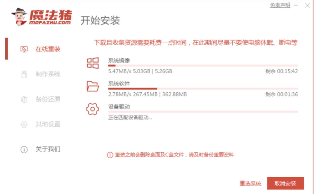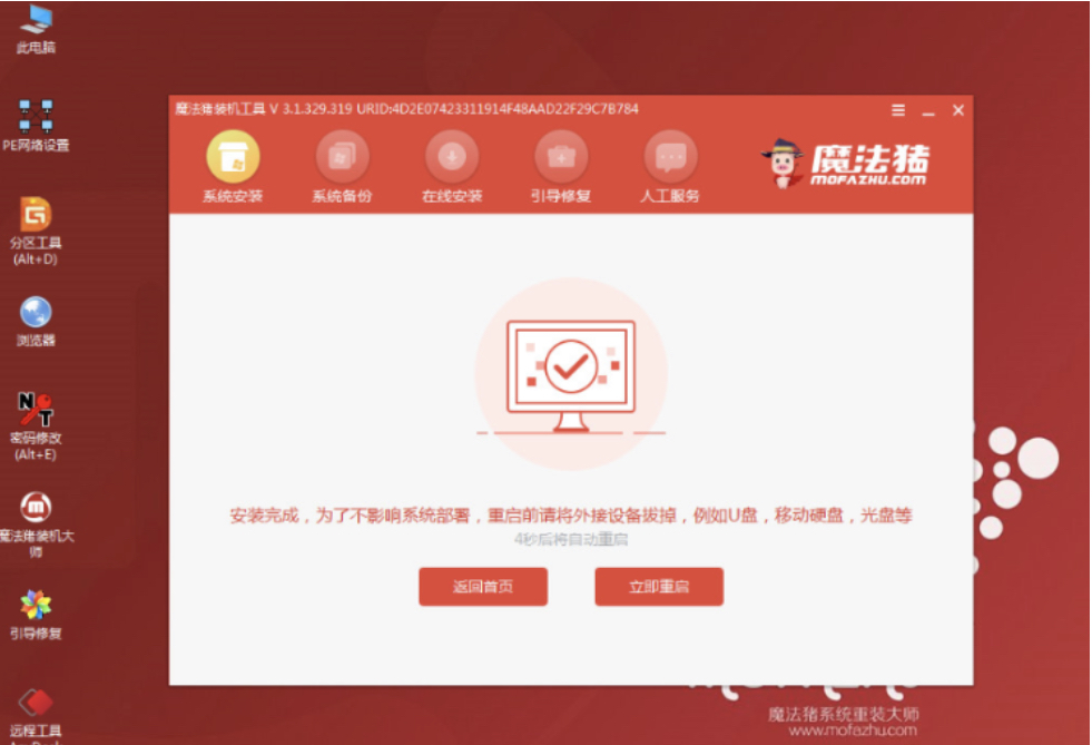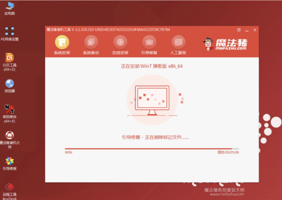 5、進入pe系統之后,魔法豬裝機工具將會自動開始安裝win7系統。