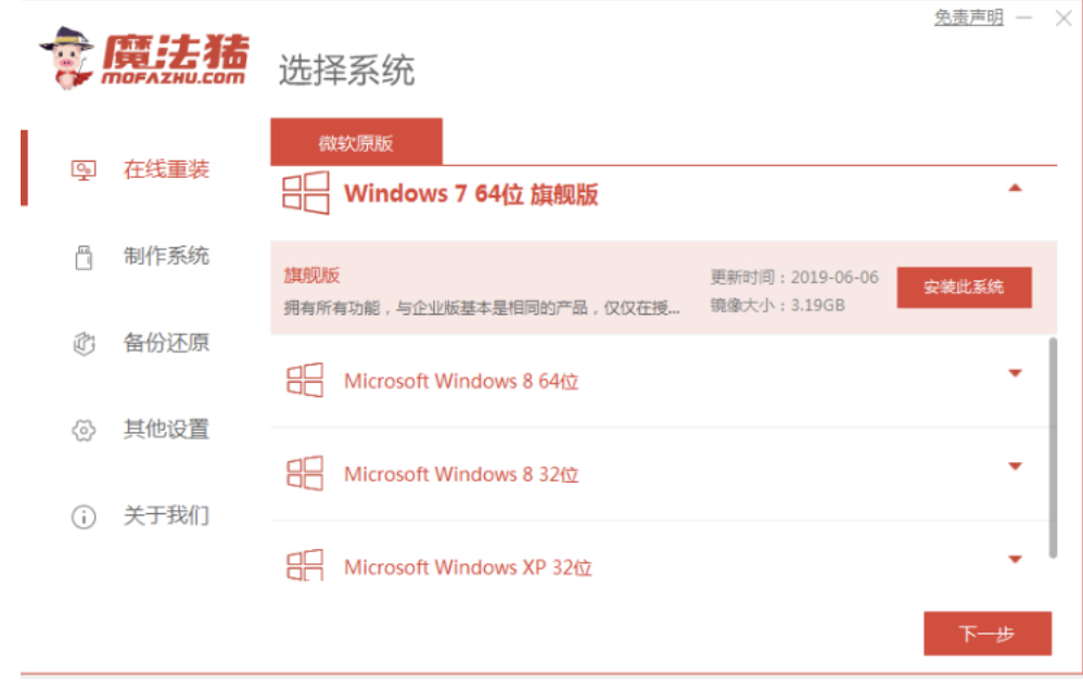 1、下載安裝魔法豬一鍵重裝系統并打開,選擇需要安裝的win7系統,點擊安裝此系統。