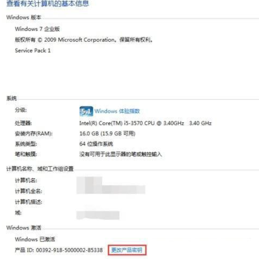 2、在新的屬性界面中點擊【windows激活】下方的【更改產品密鑰】進入。