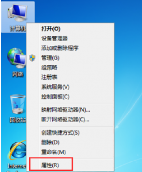1、打開win7系統的桌面,鼠標選擇【計算機】圖標,使用鼠標右擊選擇【屬性】進入。