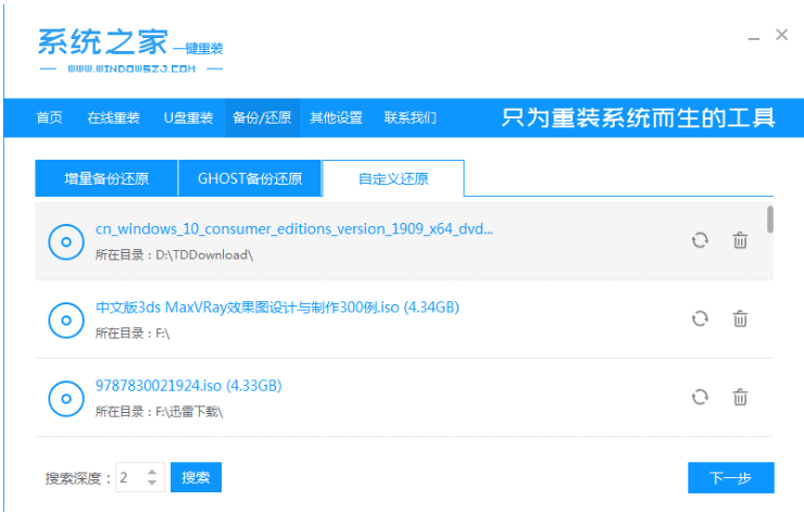 2、接著切換到“自定義鏡像還原”功能,軟件將會識別到提前下載到本地磁盤的win7系統鏡像,點擊“還原”即可。