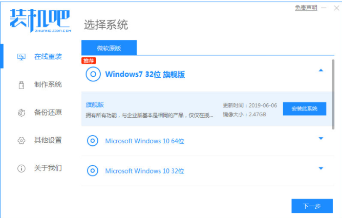1、首先在電腦上下載安裝好裝機吧一鍵重裝系統軟件并打開,選擇需要安裝的win7系統,點擊下一步。