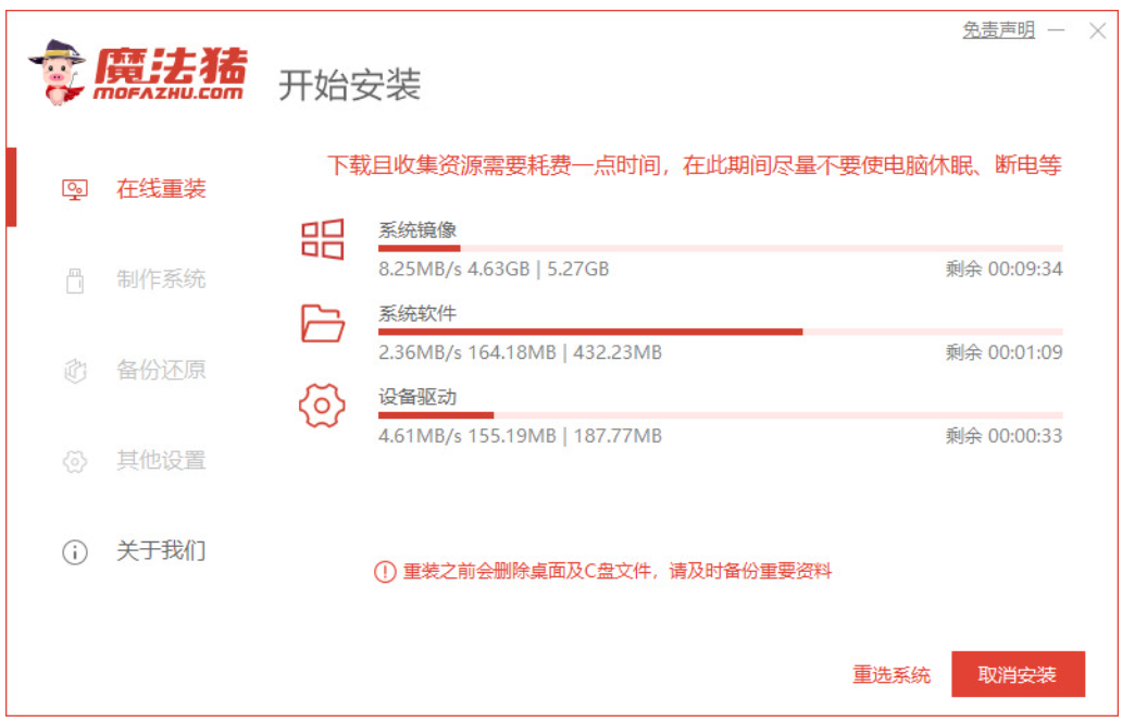 1、備份電腦c盤的資料,運行裝機軟件,進行系統的在線安裝,小編這里使用的是魔法豬一鍵重裝系統。