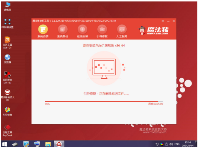 5、當電腦來到pe系統之后,魔法豬裝機工具這時將會自動開始安裝win7系統。