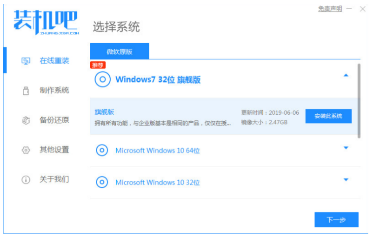 1、win7純凈系統下載安裝怎么操作呢?首先下載安裝裝機吧一鍵重裝系統到電腦上并打開,選擇需要安裝的win7系統,點擊下一步。