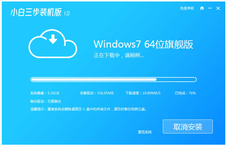 1.先在電腦上下載安裝小白三步安裝軟件,雙擊打開軟件之后選擇win7系統,點擊立即重裝。