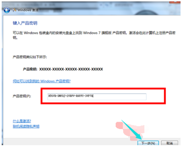 3、輸入win7系統旗艦版系統密鑰,輸入完成,選擇下一步。