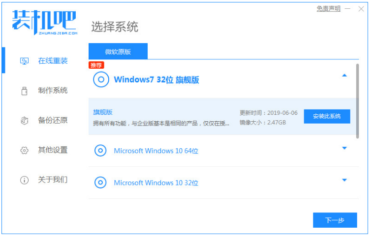 1、點擊打開電腦上的裝機吧一鍵重裝系統軟件,選擇需要安裝的win7系統,點擊下一步。