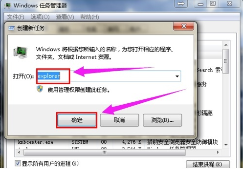 3、在打開對話框中輸入“explorer”或者“explorer.exe”點擊確定即可。