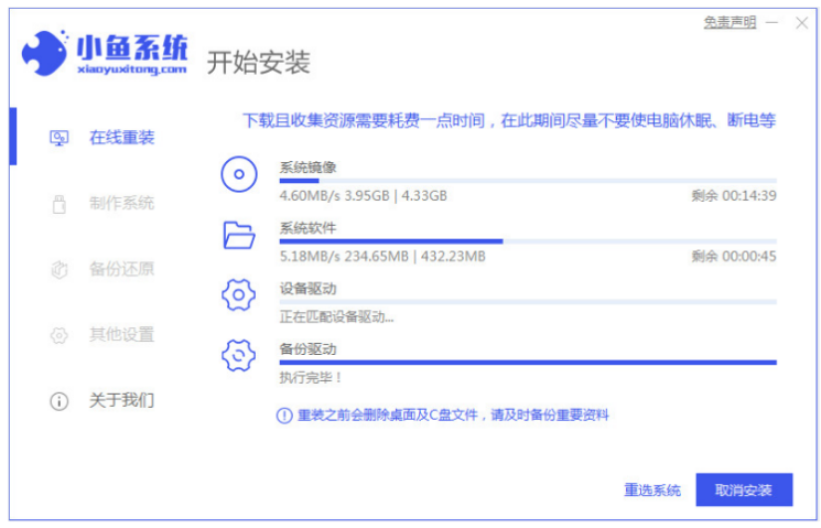 4、小魚裝機軟件將會自動安裝,直至提示系統安裝成功后點擊重啟電腦;