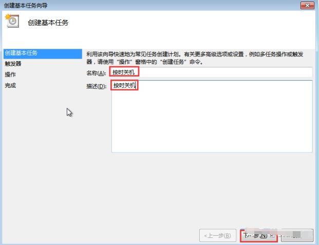 3、在對話框中的“名稱”和“描述”選項內輸入“定時關機”,點擊“下一步”。