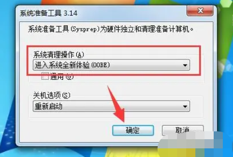 3、出現系統準備工具,選擇“進入系統全新體驗”,下方的關機選項選擇“重新啟動”,點擊確定。