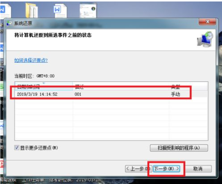 7、將打開系統還原列表,選擇一個恢復還原點,選擇好還原點后,點擊“下一步”。