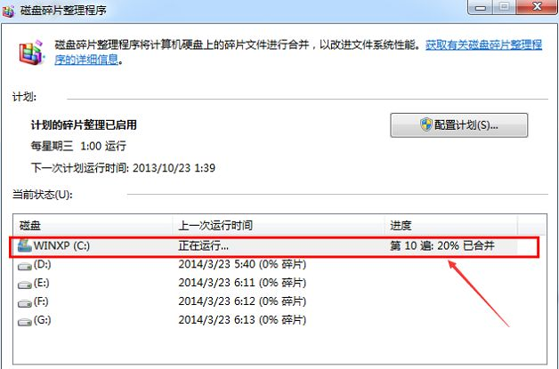 5.在出現的“磁盤碎片整理程序”界面中選擇c盤,然后點擊“磁盤碎片整理”,進入下一步。