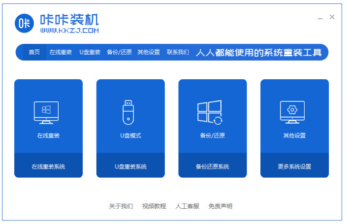 1、首先我們需要在電腦上下載安裝咔咔裝機軟件,點擊打開運行,點擊在線重裝。