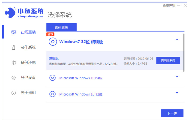 1、筆記本電腦系統一鍵重裝win7教程,我們首先下載安裝好小魚一鍵重裝系統工具并打開,選擇我們需要安裝的win7系統,點擊安裝此系統,點擊下一步。