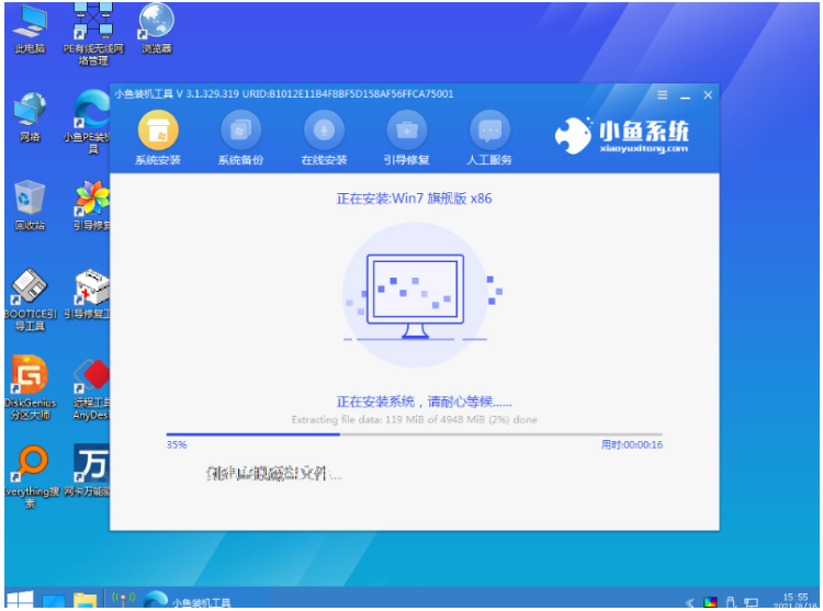 6、在pe系統內,小魚裝機軟件此時將會自動開始安裝win7系統,無需操作。