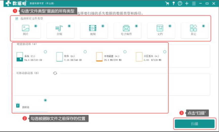 1、下載安裝數據蛙工具,打開后選擇要恢復的數據類型,勾選被刪除文件之前保存的位置,開始“掃描”。