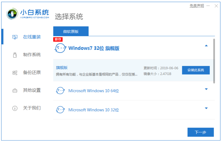 1、華碩筆記本重裝系統win7方法,首先下載安裝小白一鍵重裝系統軟件,雙擊打開此工具,點擊在線重裝,選擇需要安裝的windows7系統,點擊下一步。