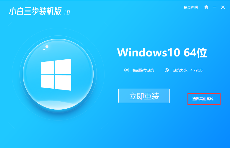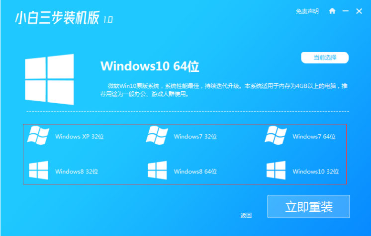 1、首先退出安全軟件,然后在小白系統官網下載安裝小白三步裝機版軟件,打開,(如果你的電腦是32位,會自動匹配32位系統)選擇系統重裝。